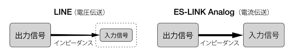 オーディオ機器では、音楽信号の強弱を、電圧の強弱で伝える「電圧伝送」が一般的です。これに対して、ES-LINK Analogは、電流の強弱や方向性で音楽信号を伝える「電流伝送」です。